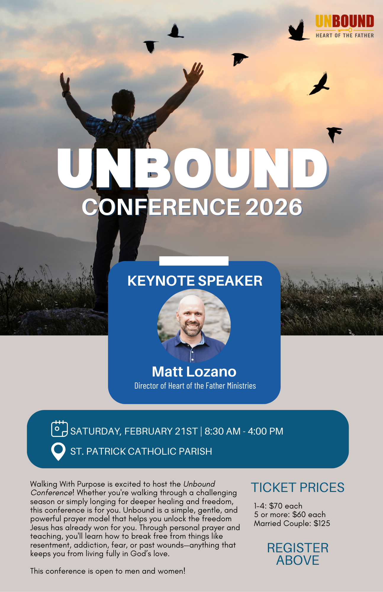 Back to All Events Unbound Conference Saturday, February 21, 2026 8:30 AM 4:00 PM St Patrick Catholic Parish 711 Rickett Road Brighton, MI, 48116 United States (map) Google Calendar ICS register