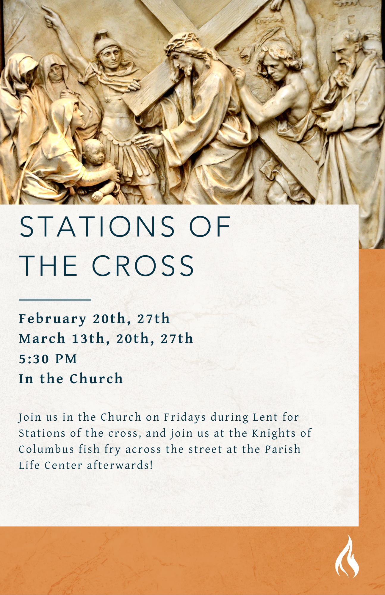 Feb 20 to Mar 27 Stations of the Cross Fri, Feb 20, 2026 5:30 PM Fri, Mar 27, 2026 6:30 PM Google Calendar ICS View Event →
